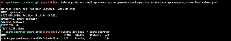 helm install spark-ops spark-operator/spark-operator — namespace spark-operator — values values.yaml