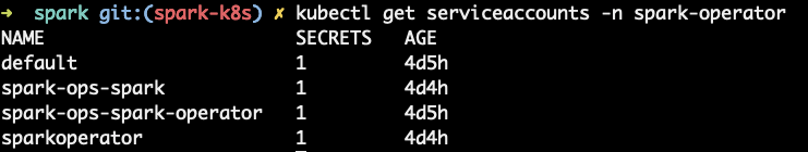 เมื่อเราลอง list ดู service account เราควรจะเห็นชื่อ sparkoperator ขึ้นมา