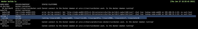 มาถึงตรงนี้ หากเราลอง docker buildx ls ดู จะเห็นว่าตอนนี้เราได้ใช้ colima ที่ยัง support linux/amd64, linux/arm64, … หลายๆ platform ชัดเจน