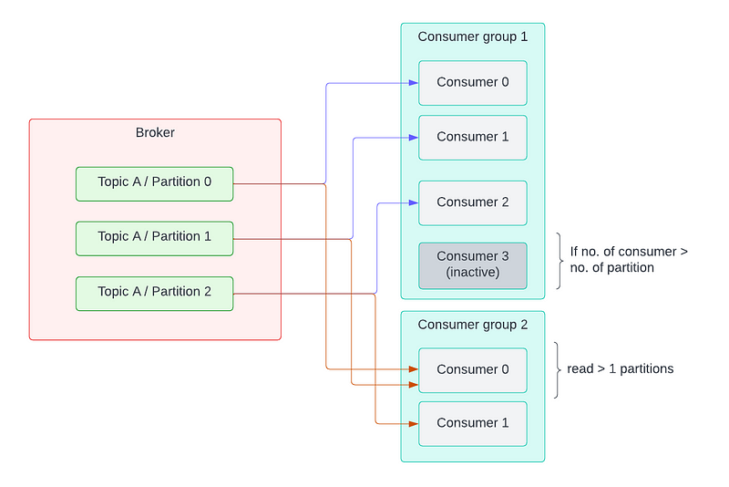คราวนี้ Consumer มี Consumer group ที่จะรวม consumer หลายตัวเข้าด้วยกัน เพื่อช่วยกันอ่าน message ในแต่ละ partition