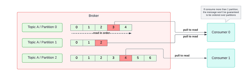 - วิธีอ่านของ consumer คือจะอ่านไล่จาก offset ต่ำไปสูงในแต่ละ partition