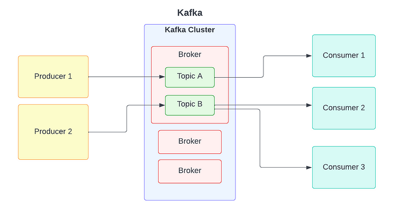 producer จะเป็นคน publish event ไปหา Kafka topics ซึ่ง consumer นั้นจะ subscribe จาก topic ที่ต้องการ โดยที่ topic นั้นจะมีหลาย consumer ก็ได้