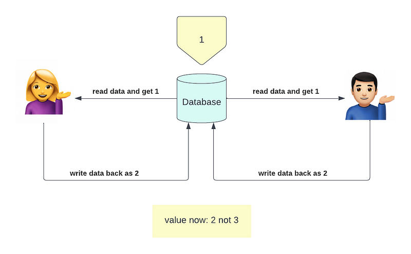 สมมติว่า 2 คนที่ตั้งใจเข้ามา read data จาก database และได้ค่า 1 ออกมาแล้วพยายามจะ write data กลับด้วยการ +1