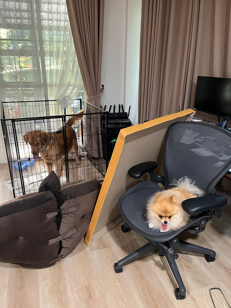 วันนี้เราตัดสินใจย้ายกรงจากตอนแรกที่อยู่หน้าบ้านมาหลังบ้าน เนื่องจากหาข้อมูลเพิ่มเติมว่าการเลี้ยงหมาให้อยู่หน้าบ้านจะทำให้เขาวอกแวกและเห่าคนที่ผ่านหน้าบ้านตลอด เลยย้ายกรงมาให้ดันเต้อยู่หลังบ้านแทน ข้างๆโต๊ะทำงานเราเลย