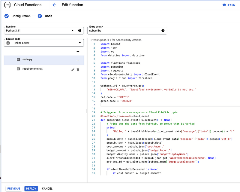 Now let’s configure Cloud Functions. We’ll name it budget-alert-notifications.