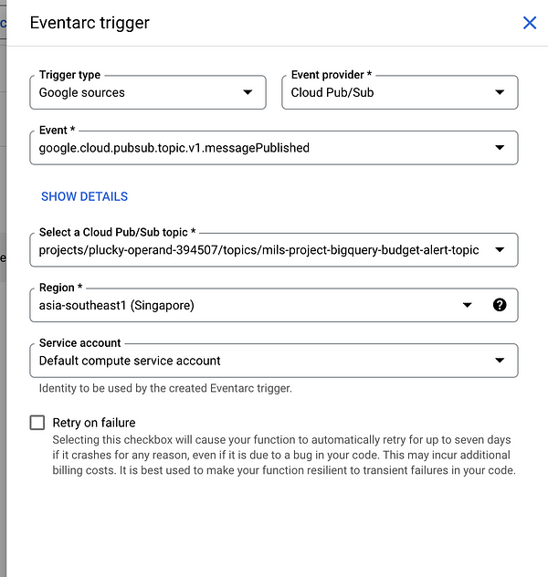 A slightly headache-inducing aspect of Pub/Sub is that it sends messages continuously regardless of the cost value. After this, if we integrate Cloud Functions, it will be triggered every time a message is sent to the Pub/Sub topic, regardless of the cost.