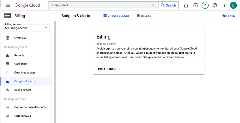 - When we navigate to console.cloud.google.com and enter the term ‘billing alert’ in the search bar, the words ‘Budgets & Alerts’ will appear.