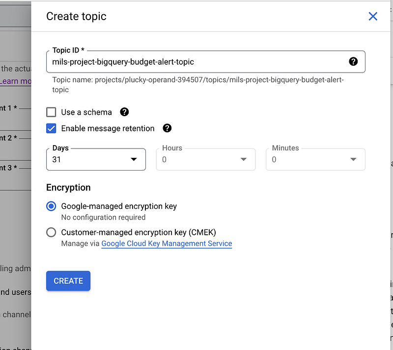 After clicking on ‘create topics,’ a popup window will appear. We will name it as mils-project-bigquery-budget-alert-topic.