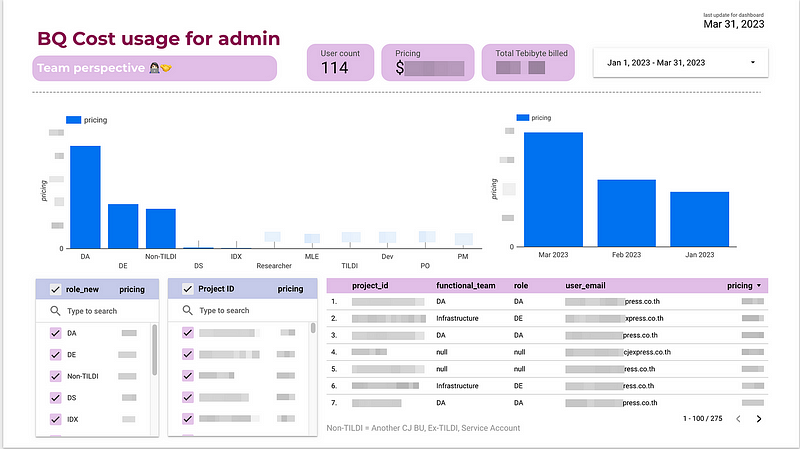 เฟสแรก เราพยายามทำ pipeline เพื่อเก็บข้อมูล usage มาดูรายวัน เพื่อดู cost การใช้งาน query แบบในหลายมุมมอง ทำให้เห็น cost ที่ตั้งใจและไม่ได้ตั้งใจ ซึ่งเราก็มี save ไปได้บางส่วน