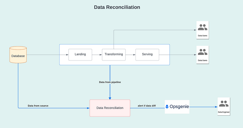 Data Reconciliation เป็นอีกหนึ่ง process ที่เราเพิ่มเข้ามาเพื่อรักษา Data Quality เทียบข้อมูลจาก Source และ pipeline ด้วยกันและส่ง output เพื่อดูว่าสิ่งที่แตกต่างมีเช่นไรบ้าง แล้ว alert หา Data Engineer