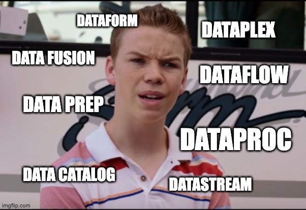 Dataform, Dataplex, Data fusion, Dataprep, Dataproc, Dataflow, Data Catalog, Datastream