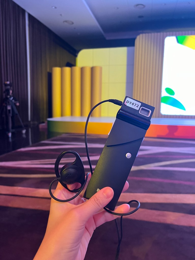ห้อง Stage จะมีทั้ง speaker ที่พูดภาษาอังกฤษและจีน หาก speaker ท่านใดพูดจีนปุ๊บ เราก็หยิบ Audio มาเสียบหูทันที จะมี translator แปลจีนเป็นภาษาอังกฤษให้ ซึ่งใช้คนแปลจริงๆนะ ไม่ได้ใช้ AI