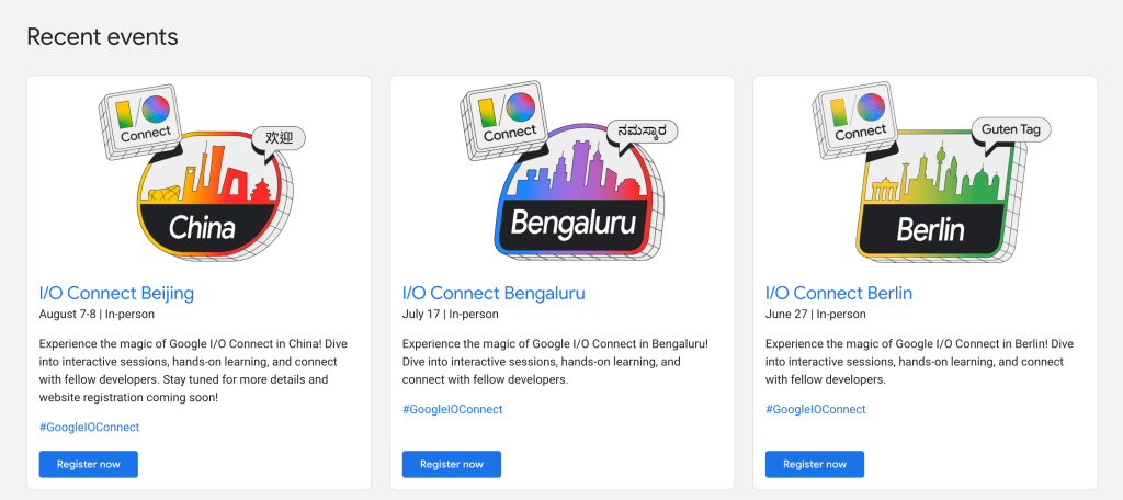 ส่วนงาน Google I/O Connect จะเป็นงานที่ Connect คนที่ชื่นชอบเทคโนโลยีเข้าด้วยกัน จัดแบบ in-person โดยเขาพยายามแบ่งเป็น Region