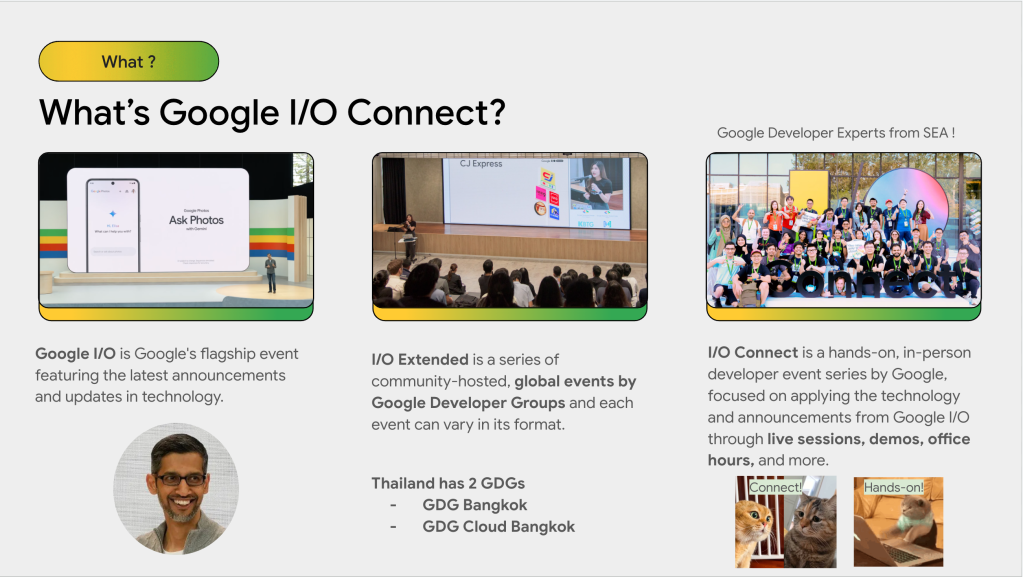 Google I/O Connect เป็นซีรี่ส์ที่ต่อเนื่องมาจากงาน Google I/O ค่ะ